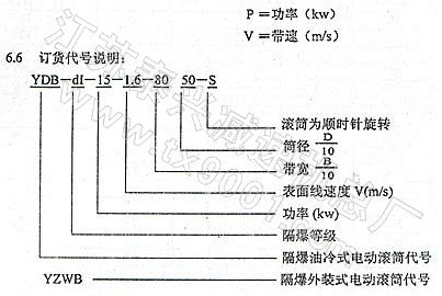 4.6单向旋转滚筒装有逆止装置,电机接线时,应根据滚筒的旋转方向标记代号查出电机的旋转方向,YDB型功率15KW以下的电机转向与滚筒转向相反.功率18.5Kw以上的电机转向与滚筒转向相同。YZWB型电机的转向与滚筒转向相同。不能查出电机转向时,可带电点动查出。逆止装置在外部的,可将逆止装置坚固螺栓拆下,使止口与滚筒端盖脱开即可点动查出。YZWB型外装式可将电机拆下查出。