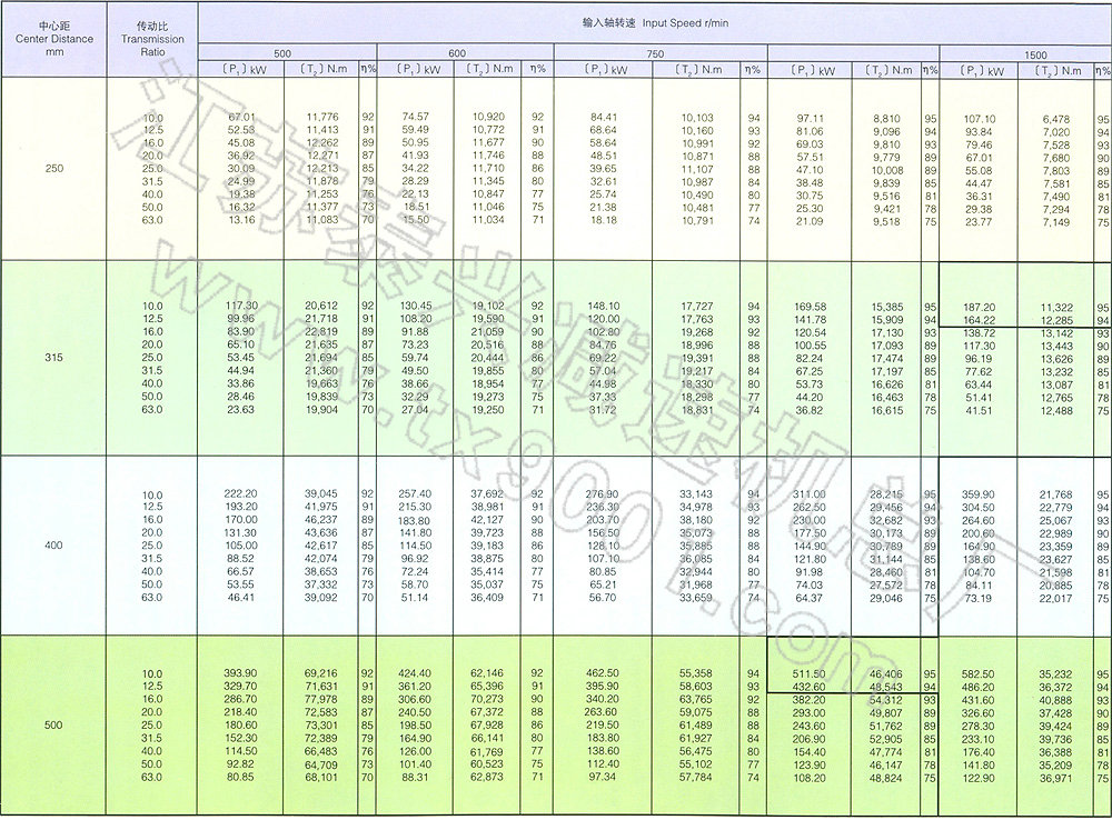 五、平面包络环面蜗杆减速器额定输入轴功率表