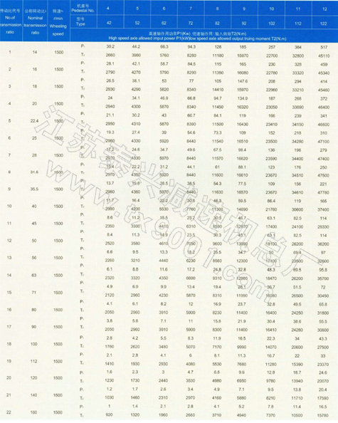 本标准减速器的承载能力受机械强度和热平衡许用功率两方面的限制,因此减速器的选用必须通过两个功率表。首先按减速器机械强度公称输入功率P1先用,如果减速器的实用输入转速与承载能力表中的四档(1500,1000,750,600)转速之某一档转速相对误差不超过4%,可按该档转速下的公称功率选用相当规格的减速器。如果转速相对误差超过4%,则应按实际转速折算减数器的公称功率选用。然后校核减速器热平衡许用功率。