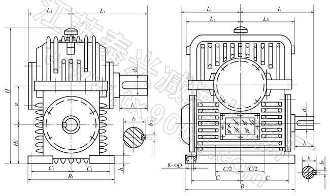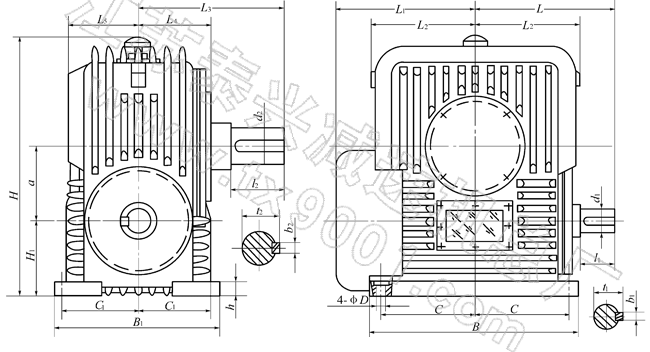 | 整体式PWU80、PWU100、PWU125、PWU140、PWU160、PWU180、PWU200、PWU225、PWU250、PWU280、PWU315、PWU355、型平面二次包络环面蜗杆减速机主要尺寸(GB/T16449-1996) |