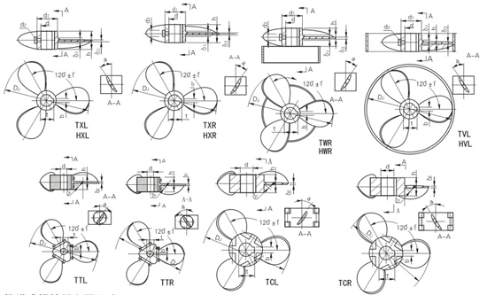 三叶左旋推进式-TXL、三叶右旋推进式-TXR、三叶左旋稳定环推进式-TWL、三叶右旋稳定环推进式-TWR、三叶左旋导流筒推进式-TVL、三叶右旋导流筒推进式-TVR、三叶焊接左旋推进式-HXL、三叶焊接右旋推进式-HXR、三叶焊接左旋稳定环推进式-HWL、三叶焊接右旋稳定环推进式-HWR、三叶焊接左旋导流筒推进式-HVL、三叶焊接右旋导流筒推进式-HVR、三叶可调左推进式-TTL、三叶可调右旋推进式-TTR、三叶可拆左旋推进式-TCL、三叶可拆右旋推进式-TCR