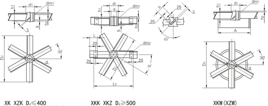六斜叶整体开启涡轮式XK、六斜叶可拆开启涡轮式XKK、六斜叶稳定环开启涡轮式XKW、六斜窄叶整体开启涡轮式XZK、六斜窄叶可拆开启涡轮式XKZ、六斜窄叶稳定开启涡轮式XZW